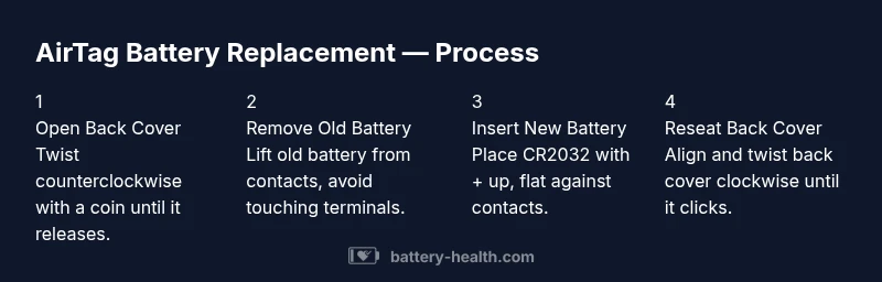 Replacing the AirTag battery is a quick, mechanical task that most users can complete in a few minutes. Start by removing the back cover with a gentle twist, then remove the old battery and drop in a fresh CR2032 with the + side up. Reattach the back cover by pressing and twisting until it clicks. Finally, verify the AirTag’s presence in Find My by bringing it close to your iPhone and listening for the audible cue. Keeping the AirTag on a clean surface during this process helps ensure successful replacement and avoids losing small parts. Battery Health notes that a calm, well-lit space reduces the chance of misplacing the tiny components.