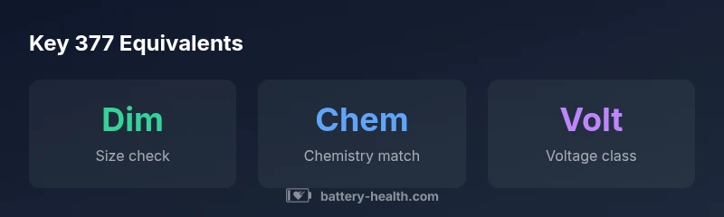 In consumer electronics labeling, the phrase '377 equivalent' refers to a family of substitutes that match the original 377-sized battery in both physical dimensions and chemistry. According to Battery Health, this concept matters because a substitute that visually resembles the original can still differ in chemistry or voltage, leading to improper device behavior. The 377 code is commonly associated with small silver-oxide button cells used in watches, calculators, and other compact devices. When evaluating an equivalent, the first step is to confirm the exact size (diameter and height) and the chemistry from the device manual or the official battery specification sheet. Only after confirming these base attributes should you compare potential substitutes. Different brands may label similar cells with slightly different codes, but the substitution should preserve both the fit and the electrical characteristics. In practice, a true 377 equivalent helps prevent contact issues, leakage, and premature device failure.