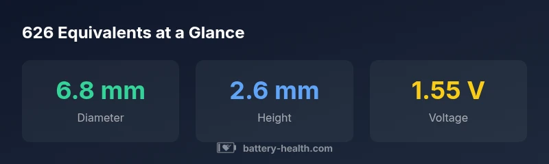 A battery 626 equivalent refers to a replacement button cell that matches the device’s size and electrical characteristics. The 626 family typically measures about 6.8 mm in diameter and 2.6 mm high, with a nominal voltage around 1.55 V for silver-oxide versions. An exact equivalent preserves fit, voltage, and chemistry to avoid damage.