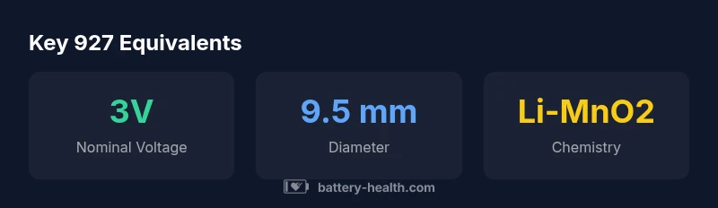 According to Battery Health, a 927 equivalent describes a coin-cell battery in the 9.5 mm diameter family that matches the standard 3V nominal voltage and footprint of the original 927 cell. The safest substitutes share identical voltage, diameter, and thickness, and are installed in devices designed for that size. Avoid higher or lower voltages, which can damage electronics. This definition helps consumers compare substitutes without guessing about fit or performance.