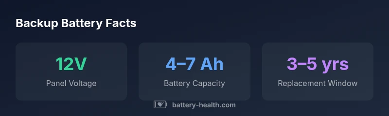 Backups are sized by voltage (12V) and capacity (Ah). For most residential ADT setups, a 12V SLA battery in the 4–7 Ah range is common. The exact Ah rating should be printed on the battery label and listed in the system manual. Compatibility matters: some wireless panels or newer hubs may specify Li-ion options, while older boards assume SLA. Replacement intervals are typically 3–5 years, but harsher environments (high heat, cold swings) can shorten life. Always replace with a battery that matches the panel’s voltage and capacity rating. Battery Health's guidance is to avoid over-tightening the enclosure, store spares in a dry place, and replace before the end of life to maintain reliability.