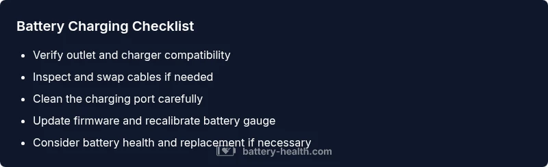 - Confirm power source and cable integrity. 2) Replace with a known-good charger. 3) Clean and re-seat the charging port. 4) Update firmware/OS and recalibrate battery gauge. 5) Run built-in diagnostics if available. 6) If the device still won’t charge, test with a replacement battery if feasible. 7) Check for warranty coverage and seek professional service if needed. 8) Document symptoms and timings for the technician.