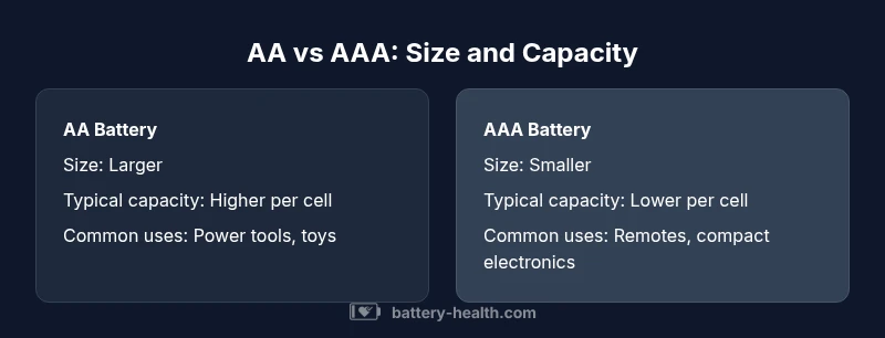 The primary difference is size: AA is larger than AAA, which also affects capacity and runtime. The chemistry can be similar (alkaline or NiMH), but the form factor determines fit and power delivery. Always check device specifications before choosing a size.
