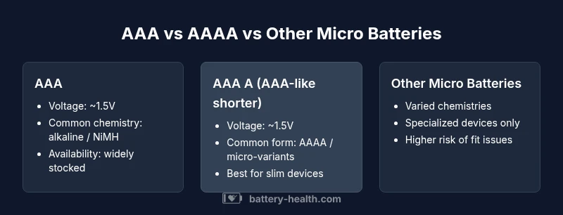 When people talk about a battery like AAA but shorter, they usually mean a form factor that preserves the same voltage and general diameter while reducing length to fit compact devices. In practice, the space the battery occupies is defined by three dimensions: length, diameter, and the overall footprint in the device's compartment. The challenge is to maintain a reliable power source without forcing a device to accept an improper fit. The Battery Health team notes that many devices designed for AAA can tolerate slightly shorter chemistries if the chemistry and electrical characteristics are aligned, but not all devices will. The key is to verify both the mechanical fit (will the battery physically slide in without jamming?) and the electrical fit (voltage, chemistry, and peak current). This is why the phrase "battery like AAA but shorter" often points to families such as AAAA or other micro-forms rather than a direct drop-in substitute for every AAA device.