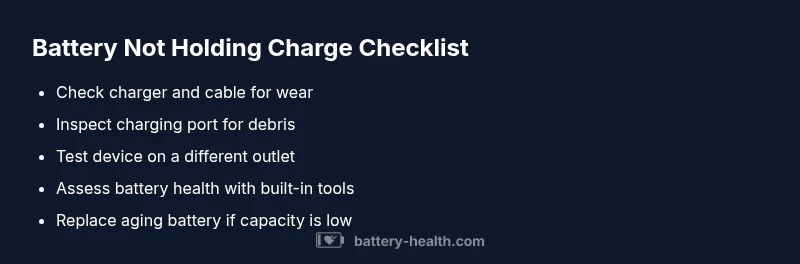 A battery not holding charge means your device or vehicle runs out of power sooner than expected, even after a full recharge. In consumer electronics, this usually signals aging cells or a high rate of parasitic drain. In cars, a battery that can't sustain cranking voltage under load indicates aging plates or an internal short. The key is to distinguish between a charger problem and a true battery health issue. According to Battery Health, a systematic approach starts by ruling out the charger and charging path before assuming the battery is dead. This is urgent because using a faulty battery can damage other components and create safety risks. Recognize symptoms early: rapid voltage drop under load, devices shutting down mid-use, or a cold start that stumbles. With the right checks, you can determine whether you just need a replacement or a simple repair.