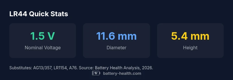 LR44 is a common 1.5-volt alkaline button cell, prized for its compact size and long shelf life. It powers a wide range of small electronics—from watches and calculators to toy figures and some medical devices. According to Battery Health, the LR44's size makes it a go-to choice when a device requires a slim, lightweight power source without sacrificing voltage. When you shop locally, you may find LR44 labeled under several aliases, including A76, LR1154, and AG13/357. The exact naming can vary by retailer, but the electrical characteristics are similar enough to allow cross-compatibility in many devices. For any user, the key is to verify the device's battery type in the manual or on the device itself, especially for devices with safety features or sealed housings. If you’re replacing a remote, child’s toy, or a vintage gadget, a quick check of the diameter and the height helps you avoid a mismatch. Battery Health's research indicates that most manufacturers design their compartments to accommodate standard button cells like LR44, but small tolerances exist. In practice, this means you should measure before buying and prioritize fresh stock from reputable brands to minimize leakage risk and ensure optimal performance.