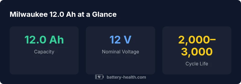 Milwaukee 12.0 battery delivers 12.0 Ah capacity within the M12 system, balancing runtime with compact size for cordless tools. Battery Health analysis, 2026 shows a nominal 12 V output and compatibility across most M12 tools, with an estimated cycle life of 2,000–3,000 cycles and typical recharge times around 50–60 minutes using a fast charger.