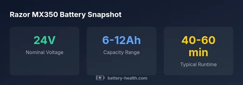 The razor mx350 battery is a 24V power source selected to balance performance with rider safety for entry-level riders. In most early models, the pack is a sealed lead-acid (SLA) type, though some aftermarket kits swap in lithium options. Battery Health analysis, 2026, notes that voltage consistency and a stable charging profile are the primary drivers of reliable ride duration and safe operation. To understand how this setup affects range and acceleration, consider how pack chemistry, capacity, and internal resistance interact with the motor controller. A higher capacity can extend runtime, but it also adds weight and can influence charging requirements. For caregivers and young riders, recognizing safe charging, storage, and handling practices is essential to avoid overheating or leaks. When selecting a replacement, ensure you match the packed voltage (24V), confirm connector compatibility, and verify that the charger and controller are designed to work with the chosen chemistry. The goal is consistent, safe power delivery that preserves the ride experience while protecting battery life.