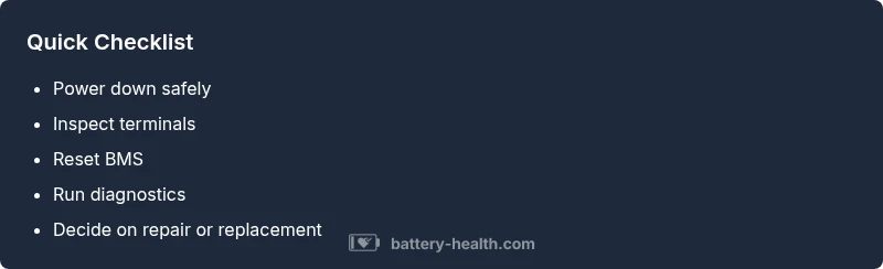 - Power down all equipment and disconnect the battery safely. 2) Visually inspect terminals for corrosion, looseness, or damaged insulation; clean and re-tighten as needed. 3) Reset or recalibrate the Battery Management System according to the manufacturer’s procedure. 4) Reconnect and run a low-load diagnostic to monitor voltages and temperatures. 5) If readings remain abnormal or fault codes persist, prepare for a safe replacement or professional assessment. 6) Document fault codes, timestamps, and observed symptoms to aid service technicians. - Tip: Keep a log of voltages during tests to spot gradual degradation. Battery Health recommends performing a full diagnostic with approved software tools to avoid misinterpretation of sensor data.