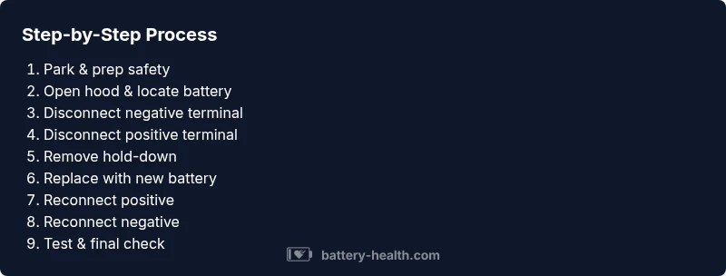 This section provides a high-level overview of the steps involved in autozone battery installation. You will prepare the workspace, disconnect the old battery, remove the hold-down, install the new battery, reconnect the terminals (positive first), and perform a final test. Each step requires careful handling to avoid sparks and short circuits. After installation, double-check that all clamps are secure and that the battery is seated properly in the tray. This overview sets the stage for the detailed, step-by-step instructions that follow, ensuring you understand the sequence and purpose of each action.