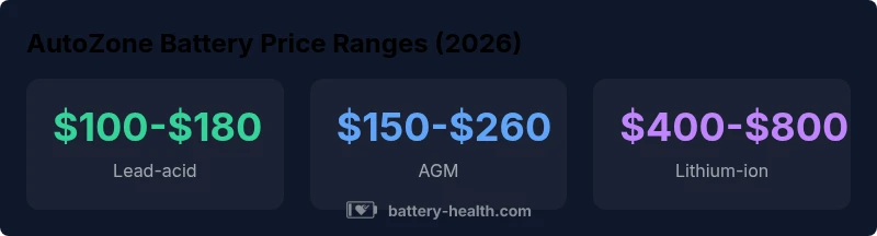 Prices differ by chemistry and capacity. Lead-acid batteries are typically the most affordable, followed by AGM designs with higher performance, and finally lithium-ion options which command a premium. Lead-acid often sits in the $100-$180 range, AGM in the $150-$260 range, and lithium-ion in the $400-$800 range. These figures are guidance ranges and can vary with vehicle type, battery size, and local promotions. When evaluating options, also account for cold-cranking amps (CCA), reserve capacity (RC), and the lifetime warranty offered. Higher-end models may deliver better cold-weather starting and longer life, potentially saving money over multiple replacement cycles. Always confirm current prices at your local AutoZone, as regional promotions can materially shift the numbers.