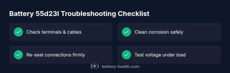 The battery 55d23l is a fault code signaling a BMS or connection issue that demands quick action. The Battery Health team notes this code most often stems from loose terminals, corrosion, or a failing module within the pack. Start with safety precautions, inspect the terminals, and perform a quick voltage check before deeper repairs.