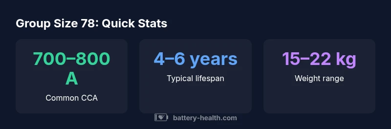 The battery 78 group size is a widely used car battery footprint found in many mid-size sedans and some SUVs. It defines the terminal layout and dimensions, ensuring fitment and reliable cold-cranking. For most models, it supports around 700–800 A CCA and a typical capacity around 70–90 Ah, depending on manufacturer.