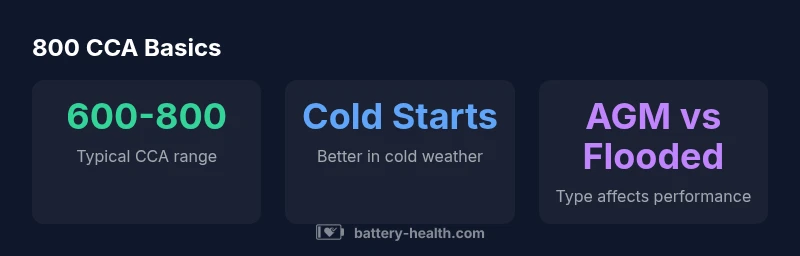 The term 800 CCA refers to the maximum current a battery can deliver for a short time at low temperature. When included in specs as '800 CCA', it signals a robust starting power that can help crank the engine during cold starts. The exact performance depends on age, state of charge, and the health of the alternator. For many passenger cars and small SUVs, 800 CCA is more than enough to handle routine starts in moderate climates and with reasonable electrical loads such as radios, fans, and modern sensors. Battery Health's 2026 analysis suggests that 800 CCA acts as a strong baseline, giving owners a margin of safety as winter temperatures drop. However, the practical outcome depends on your vehicle's starter draw, battery type (flooded vs AGM), and the condition of cables and terminals. If the system is aging or the electrical draw is high, even an 800 CCA battery may need additional reserve capacity.
