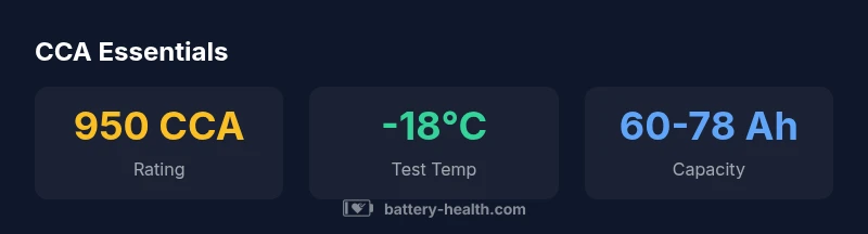 According to Battery Health, 950 CCA is a rating that signals robust cold-start power for mid-size engines in cool to moderately cold climates. CCA, or cold-cranking amps, measures how many amps the battery can deliver for 30 seconds at -18°C while maintaining the minimum voltage. This means that a battery with a 950 CCA rating should turn your engine over reliably in typical winter starts, assuming the battery is healthy and the charging system is functioning. Remember that CCA is a spec derived under lab conditions; real-world performance also depends on the battery’s age, state of charge, and the electrical load from accessories. In practice, a 950 CCA battery offers a valuable margin for winter reliability without overspending on a high-CCA option. The Battery Health team emphasizes testing the battery under your actual climate and engine size to confirm suitability.