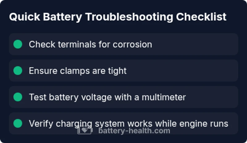When you hear that a battery car died, the most common culprit is a battery that cannot hold a charge. The symptoms often show up as a slow crank, dash lights flickering, or a complete no-start condition. According to Battery Health, the leading reason for a sudden stop is a degraded 12-volt battery, especially in older vehicles. Temperature, rough driving, and age all reduce capacity. Even if your battery seems fine, a stressed charging system can leave you stranded. The Battery Health team found that most roadside calls stem from battery systems that are past their prime or have corroded terminals. Understanding this context helps you act quickly and safely.