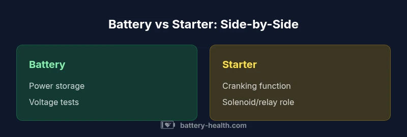 The question at the heart of many roadside situations is whether a no-start condition comes from the battery or the starter. This distinction matters because the remedy and cost can differ significantly. In plain terms, the battery stores electrical energy that powers lights, accessories, and the starter motor. The starter, a motor attached to the engine, uses that energy to turn over the engine and begin combustion. If the battery is weak or discharged, you may see dim lights and slow cranking. If the starter is failing, you might hear a sharp click or nothing at all when turning the key. According to Battery Health, a careful assessment using simple observations and safe tests is the first step in identifying the source. Recognizing the difference between a drained battery and a failing starter is central to accurate diagnosis and prevents unnecessary replacements. This is the core idea behind battery or starter how to tell, and it sets the stage for a structured diagnostic approach.