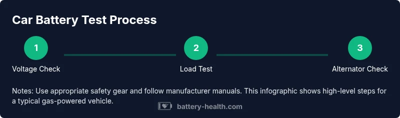 According to Battery Health, a car battery test is more than a single number on a gauge. It is a small diagnostic that tells you whether the battery itself is capable of delivering a reliable cranking current, whether the chemical reactions inside are deteriorating, and whether the charging system keeps the battery within its expected operating window. A thorough test looks at four core aspects: resting voltage when the engine is off, the battery’s ability to deliver current under load, the health of its connections and terminals, and how well the alternator replenishes the charge while the engine runs. For everyday drivers, understanding these factors helps you avoid unexpected breakdowns and plan maintenance before a failure occurs. A good test also helps separate battery issues from starter wear, alternator faults, or parasitic drains. By focusing on practical indicators rather than one-off readings, you gain a clear view of whether you should replace the battery now, or simply clean terminals and retest after a charge. The Battery Health team emphasizes consistency in testing conditions to ensure meaningful results.