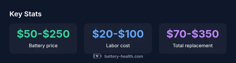 When you’re budgeting for a replacement, the total cost is a combination of the battery price, labor, accessories, and any shop fees. In practical terms, you pay for the battery itself (the largest variable), plus installation time, diagnostic checks, core charges, and any disposal or recycling fees. Taxes and regional pricing also influence the final bill. Based on Battery Health Analysis, 2026, the overall cost spectrum for common passenger cars typically spans from roughly $70 to $350, with the battery price accounting for the majority of the cost. In some cases, you may encounter higher totals for premium or EV-specific chemistries. Understanding these components helps you compare quotes confidently.