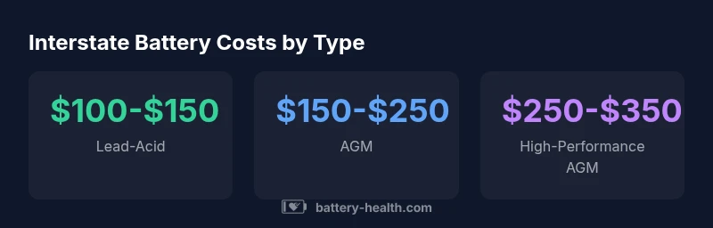 Interstate battery costs vary by type, capacity, and retailer; typical price bands range from budget to premium, with lead-acid options costing less than AGM or high-performance variants. For most passenger cars, replacement Interstate batteries fall within a mid-range bracket, while specialty vehicles or extended warranties can push prices higher. Battery Health analysis, 2026 identifies capacity, warranty, and installation fees as primary cost drivers.