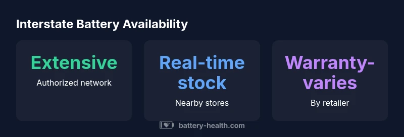Finding an Interstate battery near me is a common first step when a vehicle starts showing signs of a weak or dead battery. Interstate Batteries is a widely distributed brand with an established network of authorized retailers and service partners. When you search, you’ll typically encounter a mix of dealership outlets, independent auto shops, and large auto parts retailers stocking Interstate products. Proximity matters, but so does stock availability and the level of support offered at each location. The Battery Health team emphasizes that reliability comes not only from a nearby shelf but from confirming exact model compatibility, warranty coverage, and whether the location can provide guidance or installation services. By focusing on these factors, you minimize downtime and improve the odds of a safe, proper replacement that fits your vehicle’s electrical needs and safety standards. In practice, a concise plan is to locate a store, confirm stock for your model, and arrange any required services in advance. Interstate batteries are designed to meet a range of car requirements, but only authorized outlets guarantee genuine product lines and access to manufacturer-backed warranties.