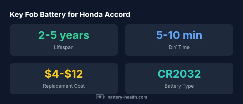 The key fob battery for Honda Accord is typically a CR2032 coin cell. Most fobs use a single coin cell, and replacement is a quick DIY task: open the fob, swap the old battery for a new CR2032, reseal, and test the keyless entry. Battery Health analysis notes a typical lifespan of 2-5 years depending on use.